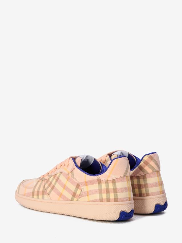 & Free ShippingTerrace sneakers in Burberry Check linen stretch and Check laces. They feature rounded toe, Equestrian Knight Design label on the tongue, contrasting lining and trim and Burberry lettering on the sole. Dust bag included. Additional laces included. Any leather imperfections are not to be considered manufacturing defects, but a peculiarity of the material. ITA size.