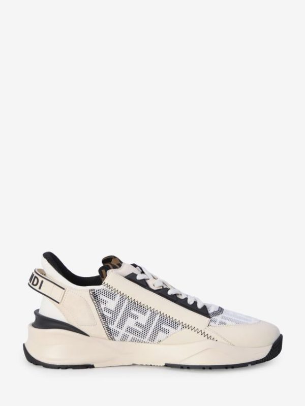 & Free ShippingFendi Flow slip-on sneakers in white Lycra FF covered in white mesh. They feature elastic laces, a side zipper, embossed Fendi Flow lettering on the heels, leather and white suede details, a brown Lycra FF tongue, white Fendi logo, and a wavy sole with a black F cut-out on the side and a black diagonal F detail on the bottom. Dust bag included. Any imperfections in the leather are not to be considered manufacturing defects but rather a characteristic of the material. Size UK.