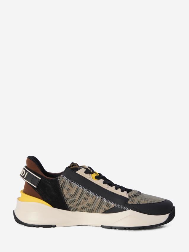 & Free ShippingFendi Flow slip-on sneakers in brown Lycra FF covered in green mesh. They feature elastic laces, a side zipper, embossed Fendi Flow lettering on the heels, leather and black suede details, a brown Lycra FF tongue, black Fendi logo, and a wavy sole with a yellow F detail on the side and a yellow diagonal F detail on the bottom. Dust bag included. Any imperfections in the leather are not to be considered manufacturing defects but rather a characteristic of the material.Size UK.
