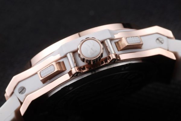 Crown: Cutwork rose-gold crown with ‘H’ engraving and two rectangular push -button crowns on either side, all studded with white rubber trimmings