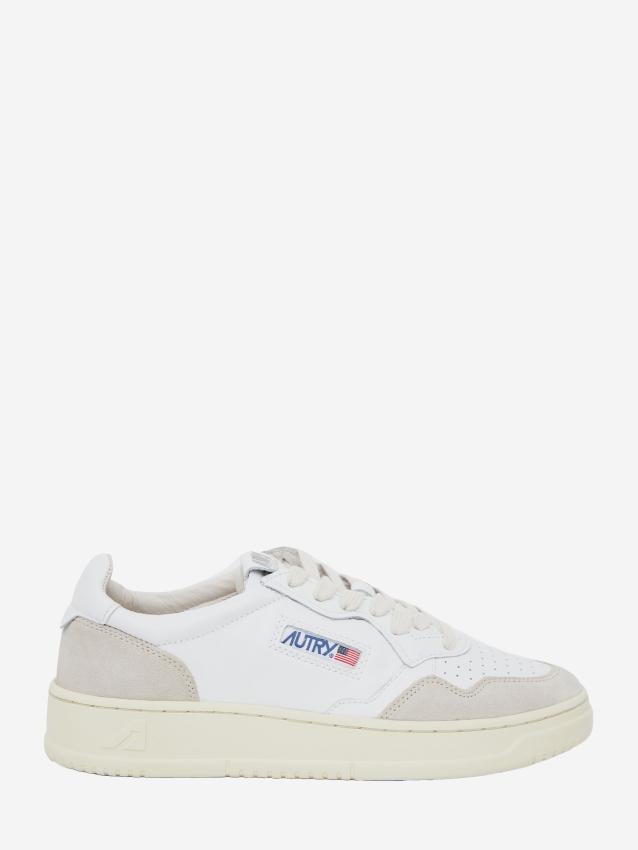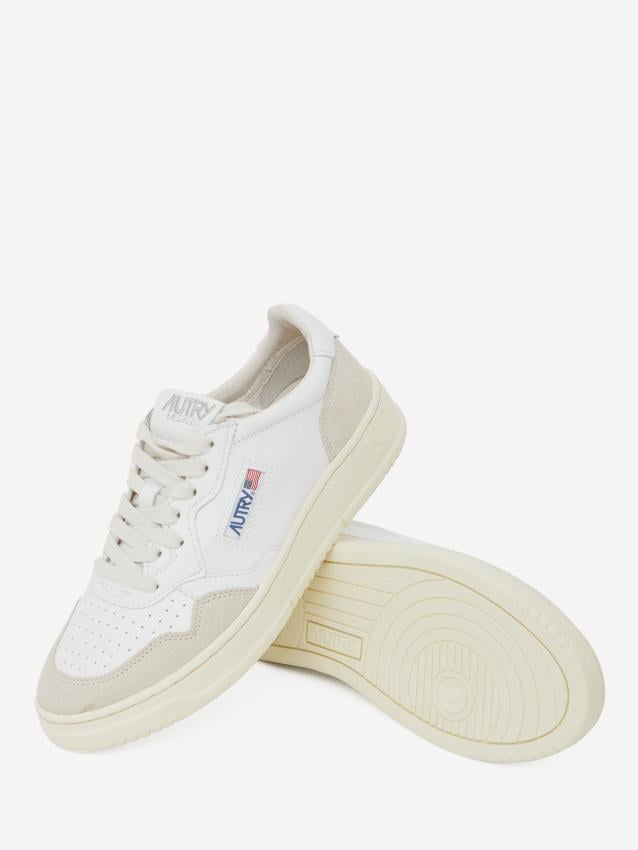& Free ShippingLow-top Medalist sneakers in white leather with suede inserts, white heel and rubber sole. They feature lace-up closure, perforated toe, side detail with Autry blue logo, logo on tongue and embossed logo at the back. Dust bag included. Any leather imperfections are not to be considered manufacturing defects, but a peculiarity of the material.Sole height: 3,5cmITA size.