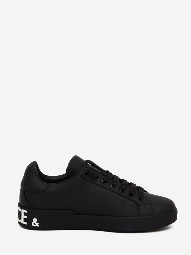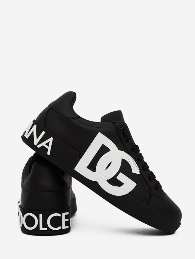 & Free ShippingPortofino DG sneakers in black calfskin with white DG maxi logo on the side and embossed Dolce & Gabbana lettering at the back. They feature lace-up closure, round toe and rubber sole. Dust bag included. Any leather imperfections are not to be considered manufacturing defects, but a peculiarity of the material.ITA size.