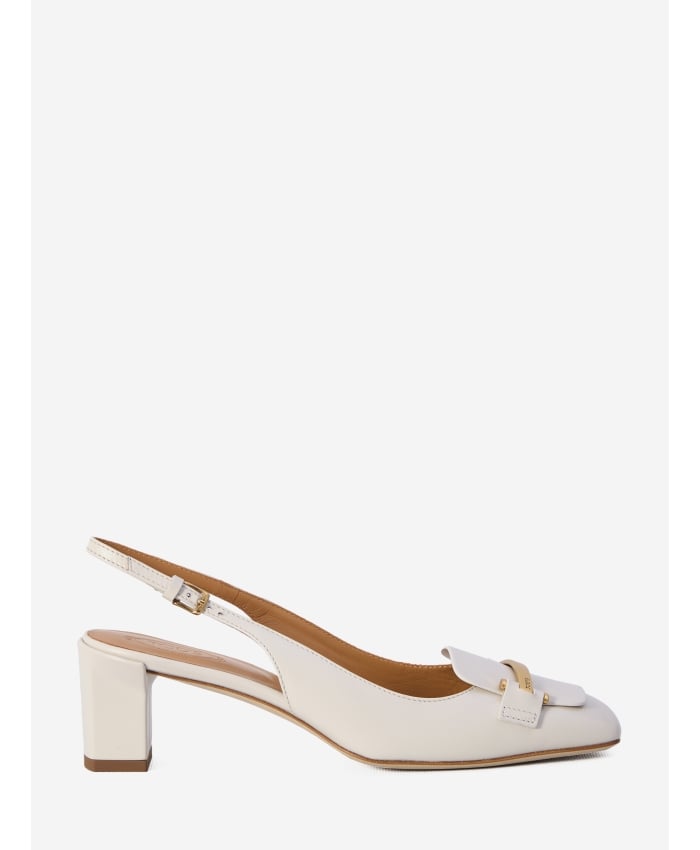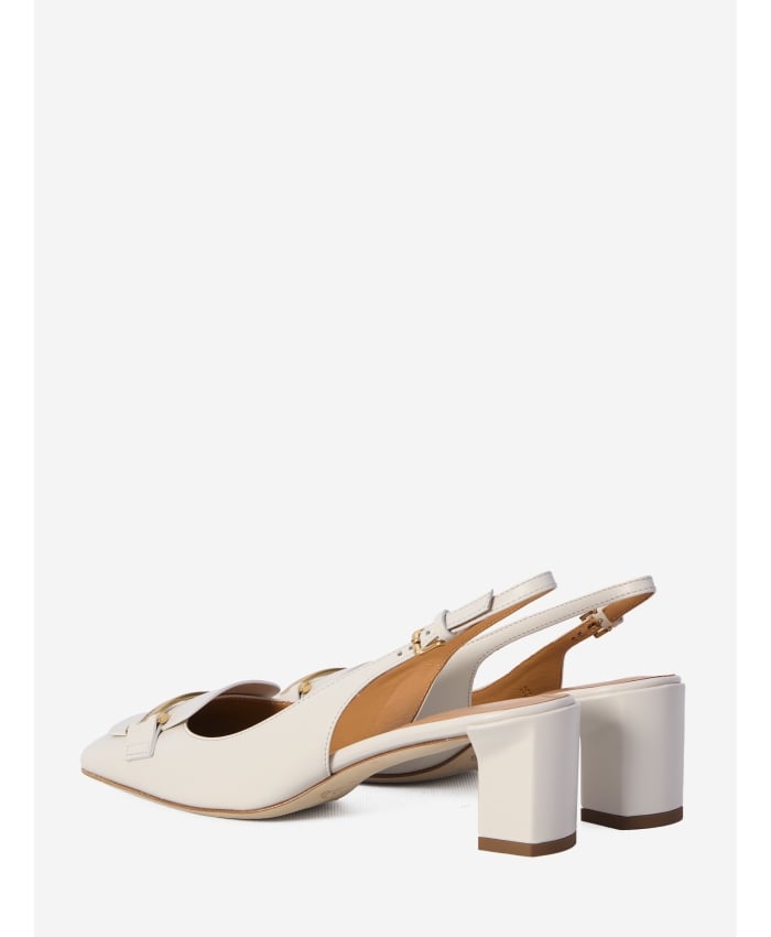 & Free ShippingWhite calfskin slingback pumps. They feature a square toe, a gold-tone metal bar with an engraved logo on the toe, an adjustable strap with a buckle, a leather insole with an embossed logo, a square leather-covered heel, and a leather sole. Dust bag included. Any imperfections in the leather should not be considered manufacturing defects but rather a characteristic of the material.ITA size