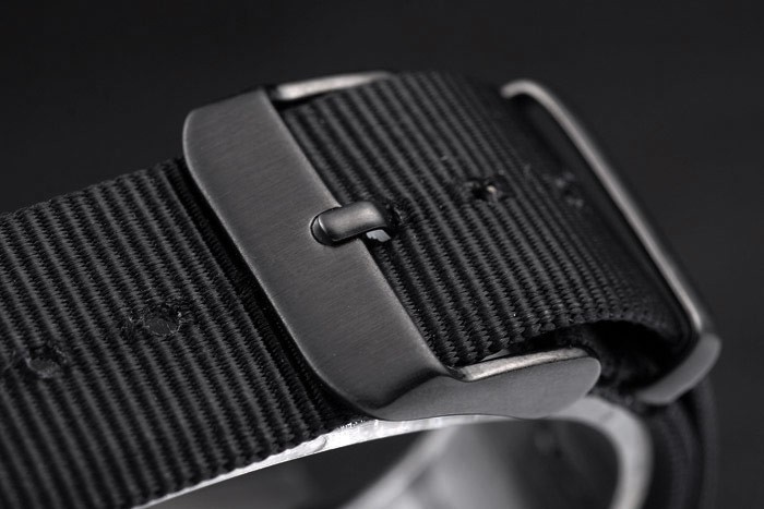 Bracelet: Black ribbed fabric strap with ion-plated hook-buckle clasp